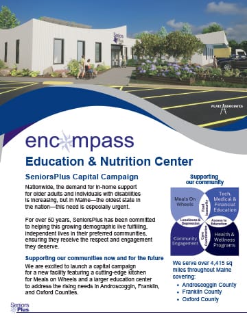 Supporting our communities today and for the future: We are excited to launch a capital campaign for a new facility featuring a cutting-edge kitchen for Meals on Wheels and a larger education center to address the rising needs in Androscoggin, Franklin, and Oxford Counties.